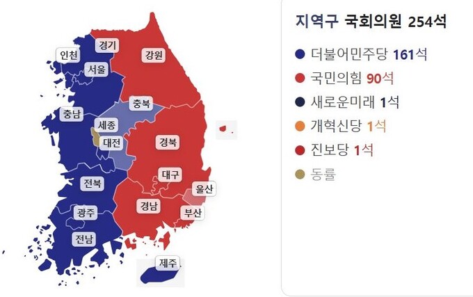 반면 강원도와 전통적으로 강세 지역인 영남권은 붉은색으로 물들었다. 강원 8개 선거구 중 6석을 확보해 우위를 지켰고 21대 총선에 이어 대구·경북의 25석을 모두 차지하고 부산·울산·경남에서 40석 중 34석을 확보했다.