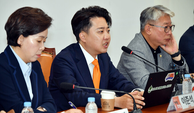 개혁신당 이준석 대표가 15일 국회에서 열리는 최고위원회의에서 발언을 하고 있다.