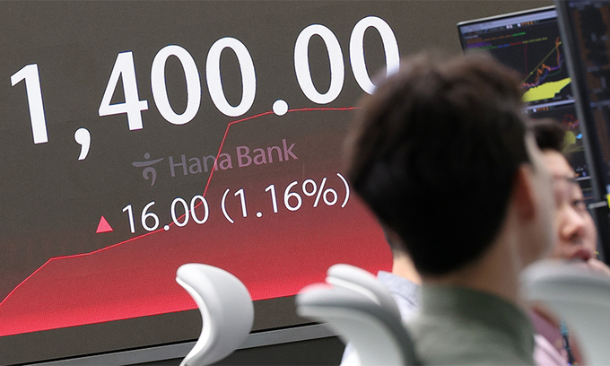 16일 서울 중구 하나은행 본점 딜링룸 전광판에 미화 1달러당 1400원을 기록한 환율 정보가 안내되고 있다. 달러 강세에 원·달러 환율이 2022년 11월 이후 1년 5개월 만에 처음으로 장중 1400원을 기록했다.