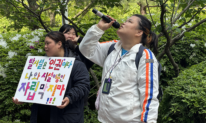 박초현 피플퍼스트 활동가는 서울시의회 의원회관을 올려다봤다. 박 활동가는 7살부터 지금까지 장애인거주시설에 살고 있는 발달장애인이다. 시설 밖 삶을 준비하고 있다는 그는 최근 ‘장애인 탈시설 및 지역사회 정착지원에 관한 조례(탈시설 조례)’ 폐지조례안이 입법예고된 이후 걱정이 많다. 시설 밖 생활을 꿈꾸고 있는 발달장애인의 탈시설이 가로막힐까 봐 그렇다. 박 활동가는 의원회관을 향해 “조례를 지켜주시고 탈시설해서 잘사는 모습을 지켜봐 주세요”라고 외쳤다.