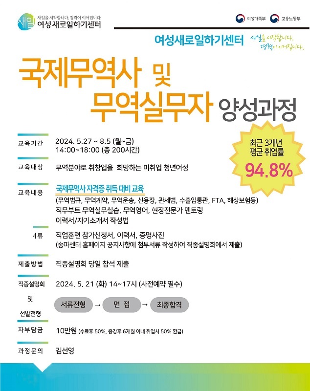 송파여성새로일하기센터는 '2024 국제무역사 및 무역실무자 양성과정' 참가자를 모집한다고 밝혔다.