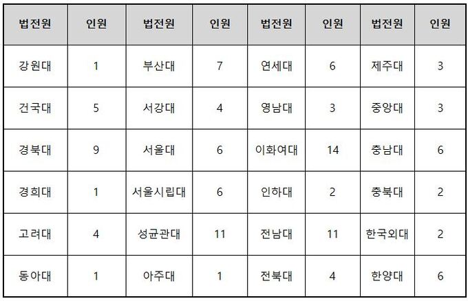 이어 성균관대 로스쿨과 전남대 로스쿨이 각각 11명, 경북대 로스쿨 9명, 부산대 로스쿨 7명 순이었다.