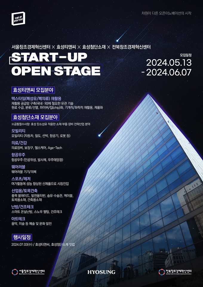 서울창조경제혁신센터(센터장 이영근)가 전북창조경제혁신센터(센터장 강영재)와 함께 ‘2024년 스타트업 오픈스테이지’를 통해 효성티앤씨, 효성첨단소재와 협업할 유망 스타트업 모집에 나선다.