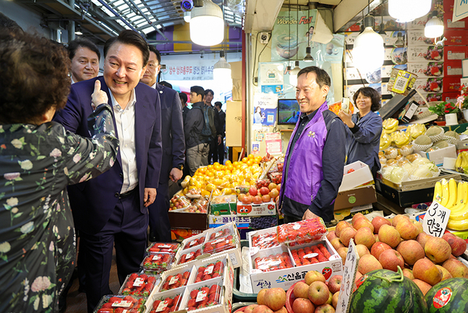 윤석열 대통령이 취임 2주년을 맞은 10일 서울 서대문구 영천시장을 찾아 시민들과 인사나누고 있다. 사진=대통령실 제공