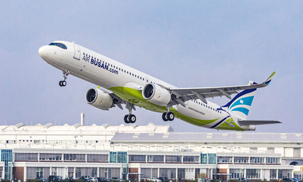 모회사(아시아나항공)가 대한항공에 인수합병 되는 와중에 자회사인 에어부산이 올 1분기 영업이익률 26.1%를 기록했다. 사진은 에어부산 주력기종인 A321neo 항공기가 이륙하는 모습이다. 에어부산 제공