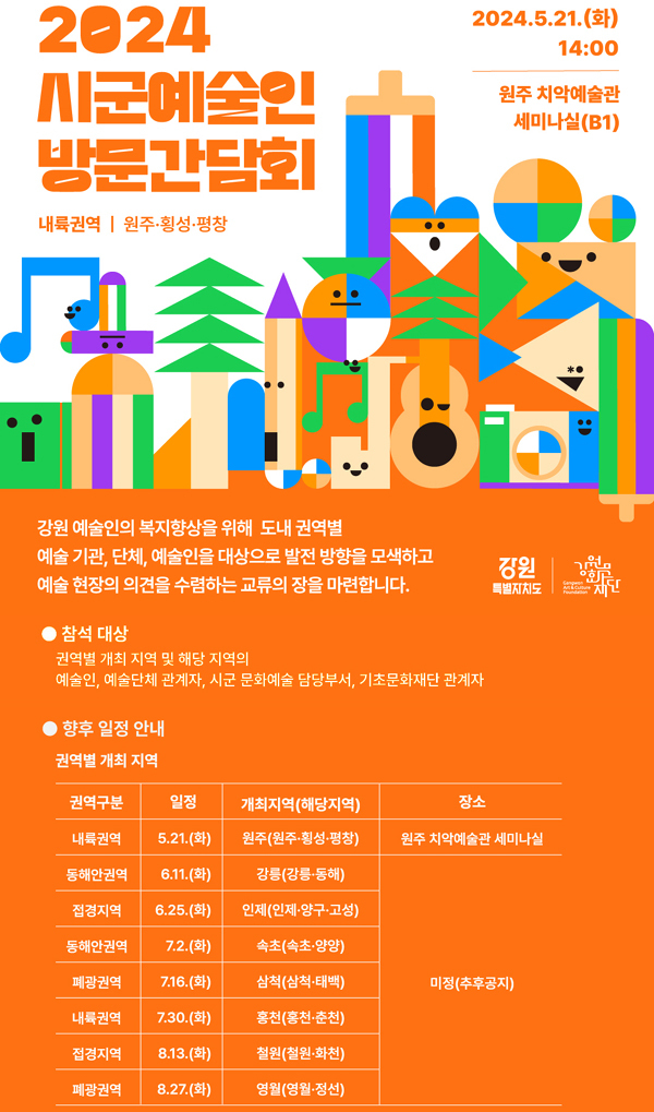 강원문화재단은 오는 21일 원주 치악예술관에서 내륙권(원주·횡성·평창) 대상 시군 예술인 방문 간담회를 개최한다고 17일 밝혔다.