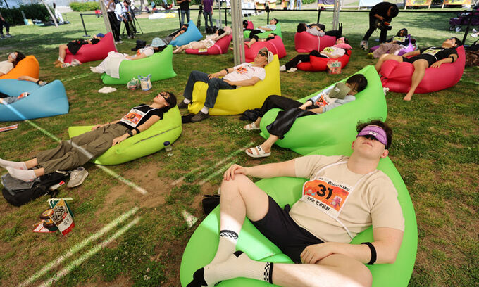 주말 들어 모처럼 맑은 날씨를 보인 18일 오후 3시. 나들이객으로 붐빈 서울 영등포구 여의도한강공원에 모인 잠옷 차림의 시민 95명이 큰 소리로 외쳤다. 이들은 저마다 안대와 마스크, 베개, 담요 등을 챙긴 뒤 자리에 드러누워 잠을 청했다. 처음엔 한낮에 야외에서 잠을 청하는 게 어색한 듯 뒤척이는가 싶더니 하나둘 숨소리가 커지며 잠에 빠져들기 시작했다. 이들은 누가 얼마나 잠을 깊게 자는지를 겨루는 ‘한강 잠 퍼자기 대회’의 참가자들이다.