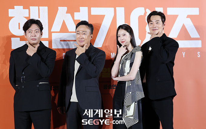 배우 박지환, 이성민, 공승연, 이희준(사진 왼쪽부터)이 27일 오전 서울 롯데시네마 건대점에서 열린 영화 ’핸섬가이즈’의 제작보고회에 참석해 포즈를 취하고 있다.