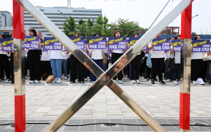 간호사들은 지난 24일 집회를 열고 “법적 보호와 보상체계가 전혀 없는 상황에서 간호사들은 온갖 업무를 도맡으며 막다른 절벽으로 내몰리고 있다”며 간호법 제정을 촉구했다. 대한간호협회는 21대 국회에서 간호법이 통과되지 않을 경우 PA간호사 제도화 전 단계로 시행 중인 ‘간호사 업무 관련 시범사업’을 거부하겠다고 경고했다. 오죽하면 “간호사가 필요할 때만 쓰고 버려지는 티슈 노동자일 수 없다”고 했겠나. 간호법은 지난해 4월 더불어민주당 주도로 국회를 통과했으나 윤석열 대통령이 “직역 간의 과도한 갈등” 등의 이유를 들어 거부권을 행사해 폐기된 바 있다. 의·정 갈등이 해소되면 간호법이 유야무야될 수 있다는 우려가 나오는 이유다.