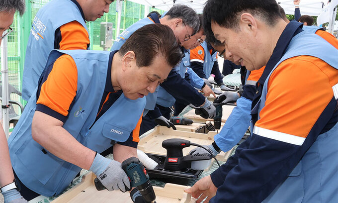 장인화 포스코그룹 회장은 이날 경북 포항 남구 대송면 제내리를 찾아 주거환경 개선 및 어르신 돌봄 활동에 참여했다. 장 회장은 이시우 포스코 사장, 천시열 포항제철소장, 포스코 재능봉사단원들과 함께 목공, 도색, 전기수리 등에 나섰다.