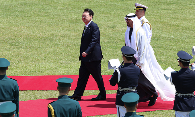윤석열 대통령이 29일 서울 용산 대통령실 청사 앞 잔디마당에서 열린 무함마드 빈 자예드 알 나흐얀 아랍에미리트(UAE) 대통령 국빈 방한 공식 환영식에서 무함마드 대통령과 의장대를 사열하고 있다. 연합뉴스