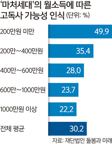 3일 재단법인 돌봄과 미래가 한국리서치에 의뢰해 지난달 8∼15일 전국 1960년대생(만 55세∼64세) 성인 남녀 980명을 대상으로 웹과 모바일로 실시한 ‘60년대생 돌봄 인식조사’(95% 신뢰수준 ±3.1%포인트) 결과에 따르면 응답자의 30.2%는 본인은 고독사할 것이라 답했다. 고독사 의견은 소득이 낮을수록 높아 월 소득 200만원 미만에서는 49.9%까지 치솟았다.