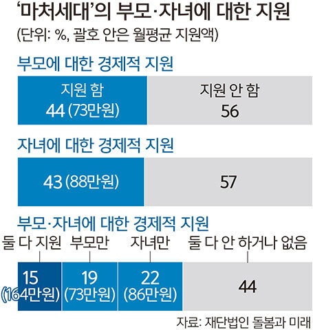 마처세대의 84%가 평균 2명의 자녀를 뒀고, 이들 중 43%가 자녀에게 경제적 도움으로 월평균 88만원을 지원하고 있었다. 부모와 자녀 모두를 부양하는 ‘이중 부양’은 15%였고, 월평균 164만원을 지출했다.
