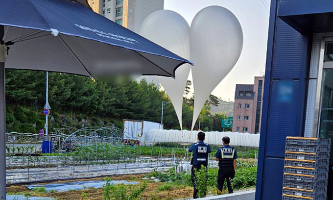 지난 5월 29일 경기 용인시 처인구의 한 텃밭에서 북한이 날려 보낸 것으로 추정되는 풍선이 발견돼 군과 경찰이 내용물을 조사하고 있다. 연합뉴스