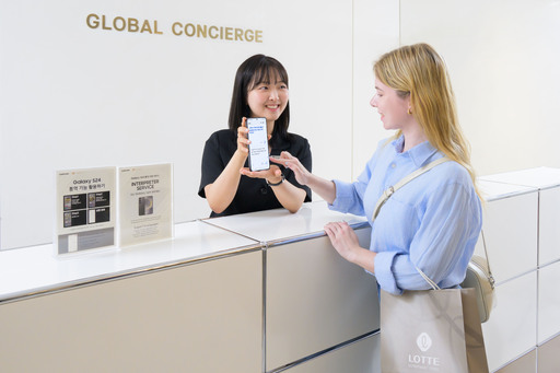 삼성전자 모델이 10일 ‘갤럭시 S24’ 스마트폰을 이용해 고객에게 통역 서비스를 제공하는 모습을 연출하고 있다. 삼성전자는 11일부터 다음 달 10일까지 전국의 롯데백화점·아울렛 매장 6곳에서 ‘갤럭시 AI(인공지능)’를 활용한 통역 서비스를 제공한다고 이날 밝혔다. 통역 서비스는 외국인이 자주 방문하는 롯데백화점 본점·잠실점· 부산 본점과 롯데아울렛 서울역점·동부산점·의왕점에서 제공된다.