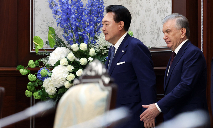 윤 대통령은 14일(현지시간) 우즈베키스탄의 수도 타슈켄트에서 사브카트 미르지요예프 대통령과 정상회담 및 업무협약(MOU) 체결식을 진행했다. 우즈베키스탄은 중앙아시아 국가 중 우리나라가 유일하게 ‘특별 전략적 동반자 관계’를 맺고 있는 국가로 고려인 동포가 중앙아시아에서 가장 많은 17만명 거주하고 있다. 양국 정상은 이날 정상회담에서 특별 전략적 동반자 관계 수립 5주년을 맞아 경제·사회·국방·개발협력·문화·교육·인적 교류 등 각종 분야에서 양국 간의 협력 기반을 강화하기로 했다. 이를 위해 ‘외교부 간 2025∼2027 협력 계획서’와 ‘한·우즈베키스탄 무역경제 공동위 활성화 약정’을 체결했다.