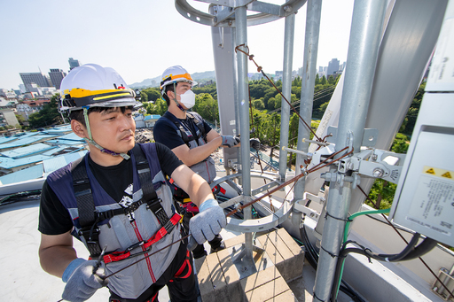 KT 엔지니어들이 서울 강남구 양재천 인근에 설치된 기지국에 달린 설비의 고정 강도를 점검하고 있다. KT는 이상고온 현상으로 발생하는 폭우에 대비해 전국 통신 시설에 대한 종합 안전 점검을 지난달 1일부터 약 40일간 진행했다고 16일 밝혔다.