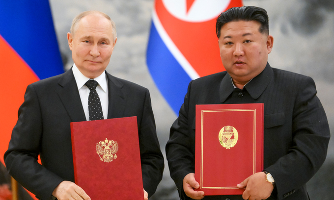 북한 김정은 국무위원장과 24년 만에 평양을 간 블라디미르 푸틴 러시아 대통령이 어제 정상회담을 갖고 ‘포괄적 전략 동반자 협정’에 서명했다. 정상회담 직후 푸틴 대통령은 “오늘 체결한 포괄적 동반자 협정은 무엇보다 조약 당사자 중 한쪽이 침략을 받을 경우 상호지원을 제공한다”고 말했다. 1961년 체결된 북·소동맹 조약에 포함됐다가 소련의 해체로 1996년 폐기된 ‘유사시 자동개입조항’이 부활한 것으로 분석된다. 김 위원장은 “지난 세기 조·소련 시기와 비교할 수 없을 정도로 새로운 번영의 시대에 진입하고 있다”고 했다. 푸틴 대통령은 “러시아는 수십년간 미국과 그 위성국의 패권적 제국주의적 정책에 맞서고 있다”며 “양국 간 소통은 평등과 상호이익 존중을 기반으로 한다”고 맞장구를 쳤다. 우려가 현실이 된 것이어서 한국과 미국, 일본의 비상한 대응이 요구된다.