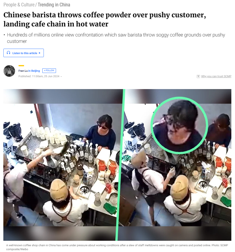 중국의 한 카페에서 한 직원이 주문을 재촉하는 진상 고객 얼굴에 커피 찌꺼기를 뿌리는 사건이 발생하자 중국 누리꾼들이 커피숍 직원을 응원하고 있다.