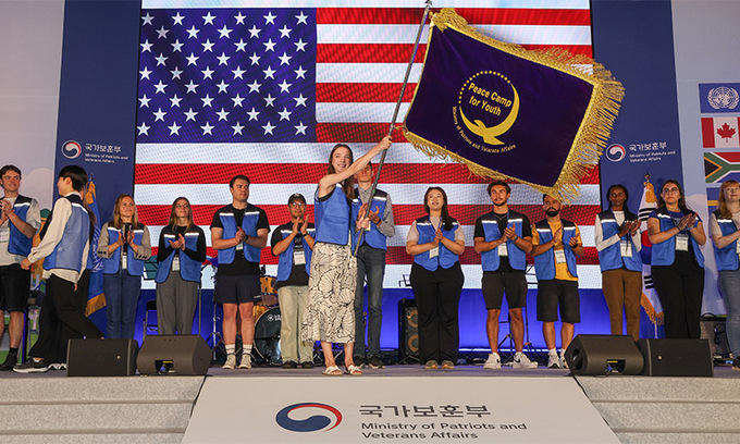 2일 경기 고양시 일산동구 삼성화재 글로벌캠퍼스에서 열린 2024 유엔참전용사 후손 교류 캠프에서 참가자들이 출정 퍼포먼스를 하고 있다. 2009년에 시작하여 올해로 15회를 맞는 유엔참전용사 후손 교류캠프는 국내외 대학교에 재학 중인 참전용사의 후손과 대학생 등 19개국 148명이 참여했다. 캠프 프로그램은 발대식을 비롯해 전쟁기념관, 유엔기념공연 등 참전 관련 시설 방문, 명사와의 이야기 공연(토크 콘서트), 비무장지대(DMZ) 안보 견학, 기억의 숲 & 자전거 동맹로드 조성 등으로 구성되며, 서울과 부산 등에서 문화체험과 조별 임무 수행도 진행된다.