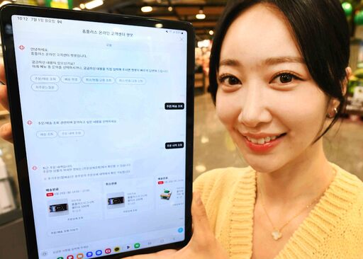 홈플러스 모델이 2일 고객 상담 서비스 질 제고를 위해 전날 도입한 ‘인공지능(AI) 챗봇 서비스’를 소개하고 있다. AI 챗봇 서비스는 홈플러스 온라인 애플리케이션(앱) 로그인 후 마이페이지 우측 하단에 있는 별도 아이콘을 통해 확인할 수 있다.