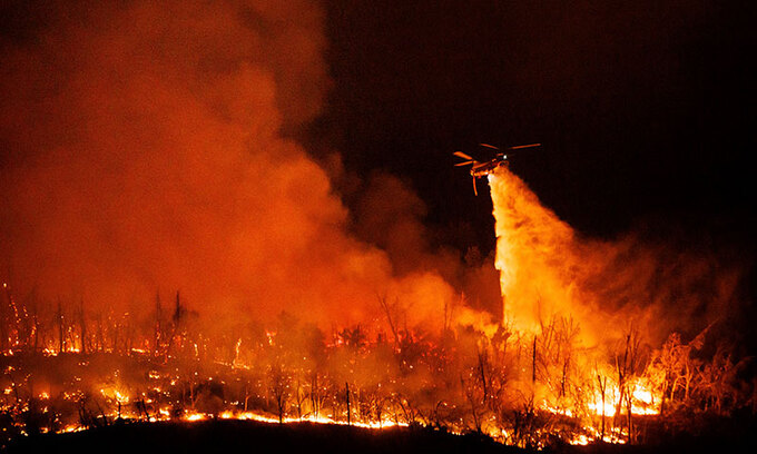 2일(현지시각) 미국 캘리포니아주 오로빌에서 산불이 번지는 가운데 소방 헬리콥터 한 대가 진화를 위해 물을 뿌리고 있다. 캘리포니아 북부에는 폭염 장기화로 화재 위험 적색경보가 내려져 있으며 정전 사태도 속출하고 있다.