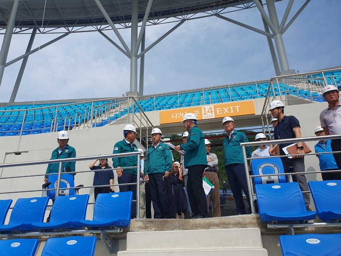 4일 경남도에 따르면 지난 1일 최만림 행정부지사가 김해시 주 경기장을 찾아 VIP접견실, 성화대, 천장 태양광 패널 등 시설과 안전 상태를 점검했다.