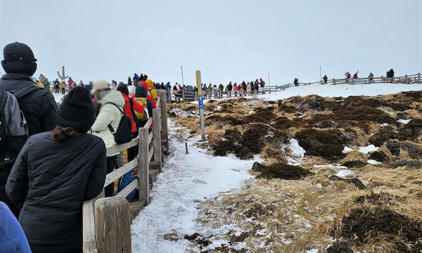 탐방객 김모(41·서울)씨는 “한라산 정상의 장관을 즐기는 여유를 찾기보다는 너도나도 백록담 표지석 인증샷을 담기 위해 한 시간 가까이 줄 서는 데 시간을 허비했다”라며 “20∼30분 줄을 섰다가 하산 시간이 다가와 포기했다”고 말했다.