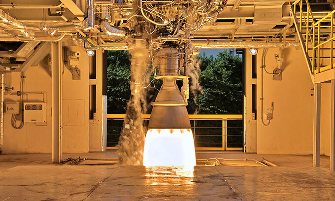 우주항공청과 한국항공우주연구원이 3일 누리호 4차 발사를 위한 1단용 75t급 엔진 조립을 완료하고 전남 고흥 나로우주센터에서 엔진 성능검증 수락 연소시험을 진행했다고 4일 밝혔다. 수락 연소시험은 발사체 장착 전 최종 성능을 검증하는 연소시험이다. 사진은 누리호 4차 발사 비행모델 1단 엔진 수락 시험 모습.