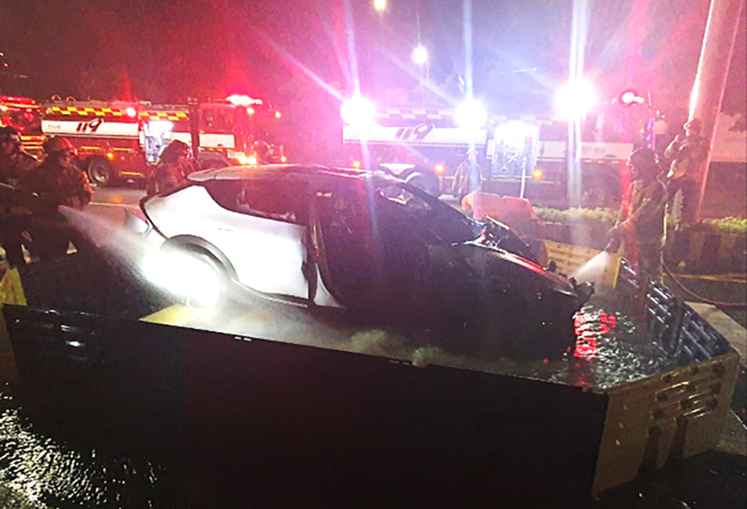 사고 직후 해당 차량에서 불길이 일었던 것으로 전해졌다. 신고를 접수한 소방 당국은 이동식 소화 수조 등을 동원해 3시간 50여분 만에 불을 껐다. 차량 내부에서 남성으로 추정되는 시신 한 구가 발견됐다.