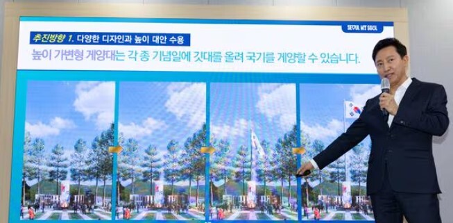 앞서 지난달 25일 오 시장은 2026년까지 광화문광장에 100m 높이의 태극기 게양대와 영원한 애국·불멸을 상징하는 조형물 ‘꺼지지 않는 불꽃’을 조성하는 내용의 ‘광화문 국가상징공간 조성 계획’을 발표했다.