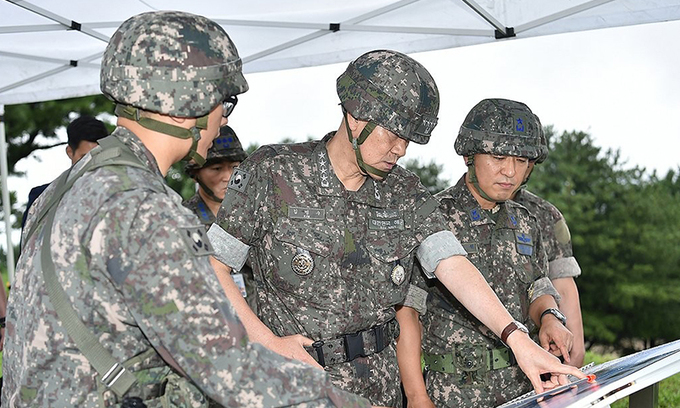 김명수 합참의장이 8일 수도권에 위치한 공군 미사일방어포대에서 적 공중도발 대비 방공 대비 태세를 점검하고 있다. 연합뉴스