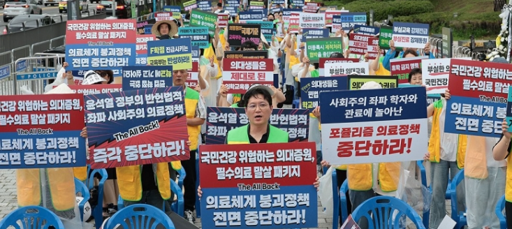 의학모는 지난 17일 오후 서울 용산구 전쟁기념관 앞에 모여 기자회견을 열고 ‘포퓰리즘 의료정책 중단하라’, ‘의료체계 붕괴정책 전면 중단하라’ 등의 문구가 적힌 피켓을 들고 나섰다.