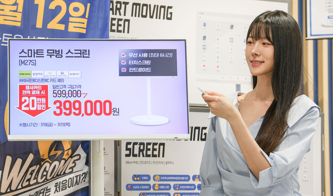 22일 서울 용산구 이마트에서 '스마트 무빙 스크린'이 소개되고 있다. 이마트가 이번에 선보이는 이동식 스마트 티비 '스마트 무빙 스크린'은 27인치 화면에 터치스크린 탑재, 안드로이드 OS 기능으로 사용의 편리함을 더했다. 7월 25일까지 전국 이마트 및 일렉트로마트에서 구매 할 수 있으며 행사카드 결제시 기존 대비 30% 이상 할인된 399,000원에 구매할 수 있다.