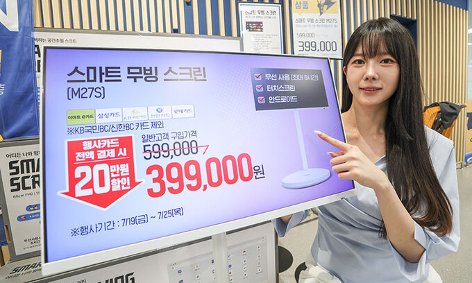 이마트 모델이 22일 서울 용산구 이마트에서 이동식 스마트TV인 ‘스마트 무빙 스크린’을 소개하고 있다. 27인치 화면에 터치스크린, 안드로이드 운영체계 기능을 탑재한 스마트 무빙 스크린은 25일까지 전국 이마트 및 일렉트로마트에서 구매할 수 있으며 행사카드 결제 시 30% 이상 할인된 39만9000원에 구매할 수 있다.
