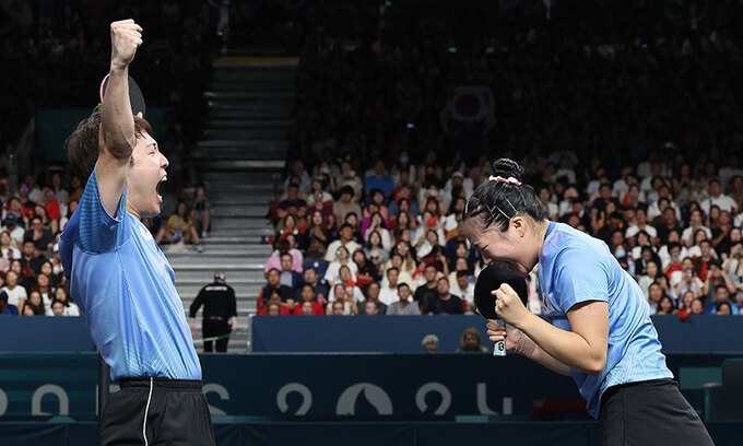 탁구 한국대표팀 임종훈(왼쪽)과 신유빈이 30일(현지시간) 프랑스 파리 사우스 파리 아레나4에서 열린 2024 파리 올림픽 혼합복식 동메달 결정전에서 홍콩에 승리한 뒤 환호하고 있다.