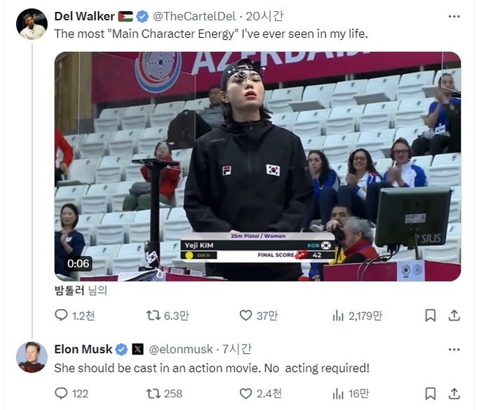 머스크는 ‘영화 캐릭터처럼 보이는데 어떻게 실제 인물일 수 있을까’라는 글과 함께 같은 영상을 올린 또 다른 엑스 이용자 계정에도 “액션 영화에도 사격 세계 챔피언이 나온다면 멋질 것 같다”고 호응했다.