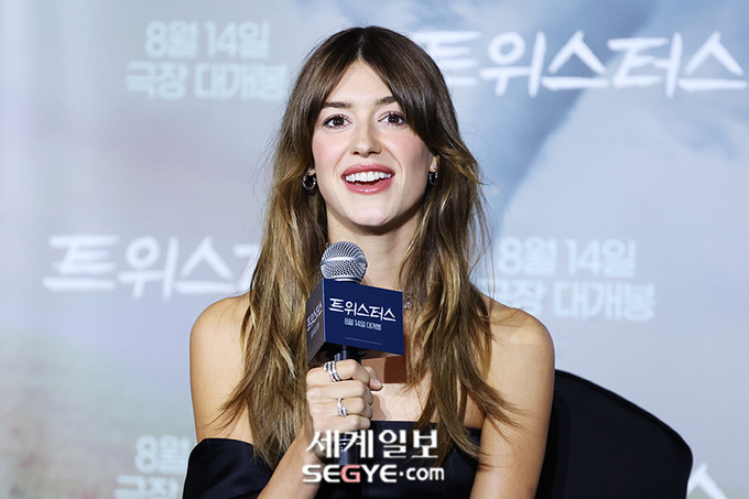 배우 데이지 에드가 존스가 7일 오후 서울 CGV 용산에서 열린 영화 ’트위스터스’의 기자 간담회에 참석해 취재진의 질문에 답하고 있다.