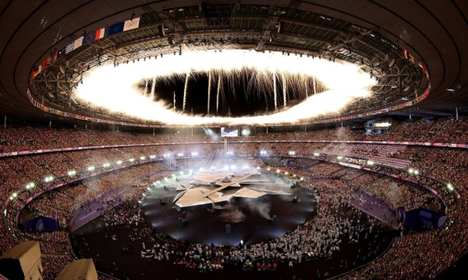 스타드 드 프랑스 공중에 오륜이 완성되는 순간, 화려한 불꽃놀이가 펼쳐졌다.