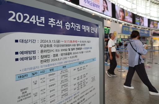19일 서울역 대합실 안내판에 2024 추석 승차권 예매 안내문이 붙어 있다. 한국철도공사는 19일부터 22일까지 온라인과 전화로 예매를 진행한다.