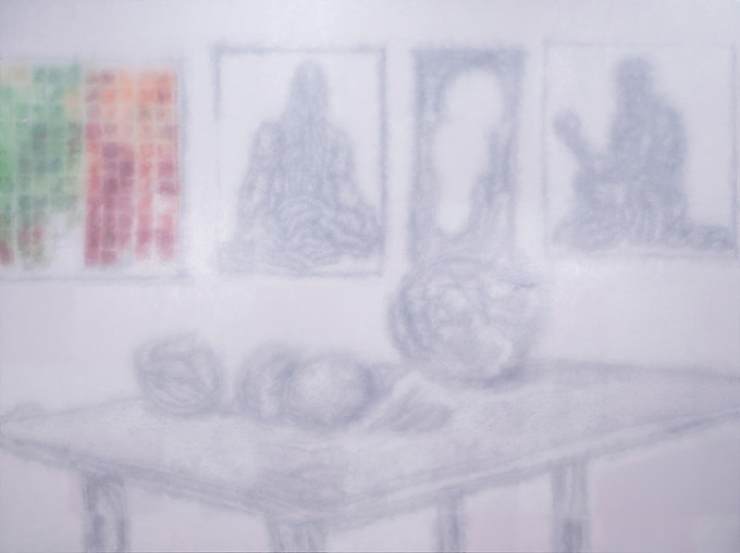 그림을 그리는 작가에게 작업실이란 날마다 마주하는 일상적 공간인 동시에 자신을 자신이게끔 하는 모든 사물과 기억, 예컨대 화구와 물감들, 그리다 만 그림들과 그려야 할 공백들, 수많은 시간의 기록과 감정이 켜켜이 중첩된 입체적이고도 상징적인 장소이다. 스스로의 작업대를 바라보다 시선이 그곳에 닿기까지의 경로를 메운 투명한 입자들을 상상하고, 시시각각 흘러가는 시간을 촘촘히 숨쉬는 과정 가운데 형상의 윤곽은 수차례 덧쓰인 기억처럼 희뿌옇게 무디어진다. 마치 대상 위에 포개어지는 시선의 불가피한 진동처럼, 매순간 색채를 달리하는 정서의 어렴풋한 흔들림처럼.