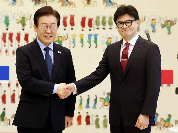 한동훈 국민의힘 대표와 이재명 더불어민주당 대표가 1일 오전 서울 여의도 국회에서 열린 국민의힘-더불어민주당 당대표 회담에 앞서 악수를 하고 있다. 뉴시스
