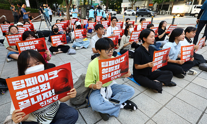 진보당 딥페이크 성범죄 대응 태스크포스(TF) 관계자들이 지난달 31일 서울 중구 청계천 인근에서 딥페이크 성범죄에 대한 강력수사를 촉구하는 집회를 열고 있다.