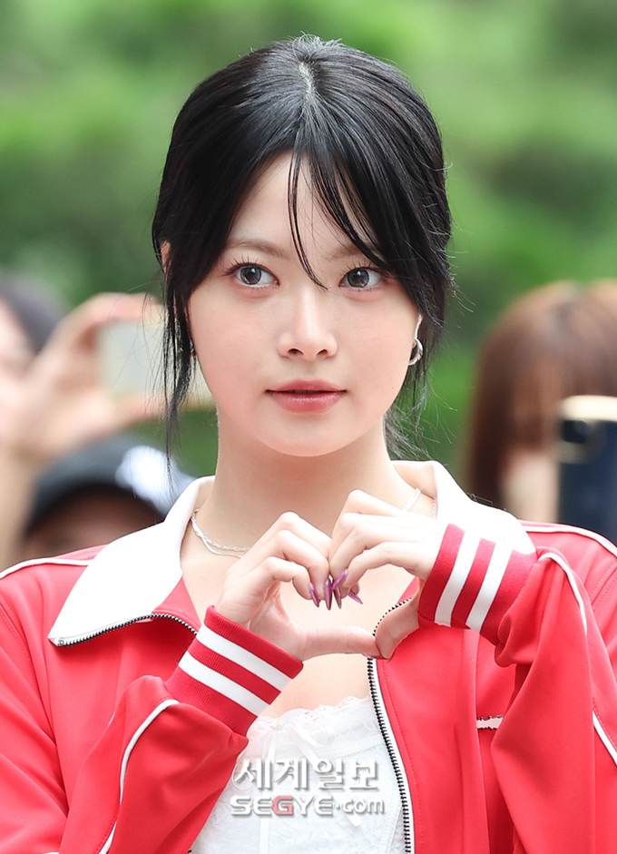 그룹 르세라핌 홍은채가 6일 오전 서울 영등포구 여의도동 KBS 신관에서 진행된 KBS2 '뮤직뱅크' 리허설에 참석해 취재진을 향해 포즈를 취하고 있다.