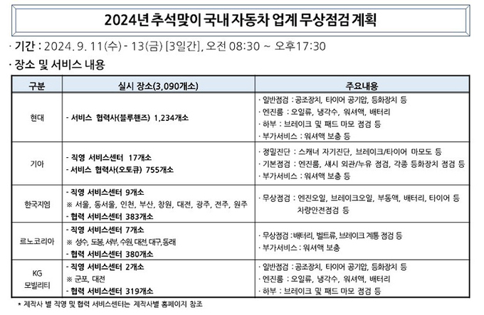 이번 추석맞이 자동차 무상점검 행사는 11∼13일 현대자동차·기아·한국지엠·르노코리아·KG모빌리티 등 국내 5개 제작사가 모두 참여해 진행된다.