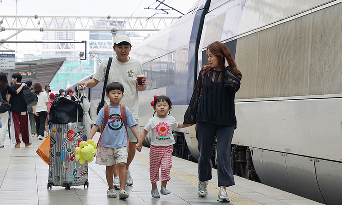 추석 연휴를 이틀 앞둔 12일 귀성객으로 보이는 가족이 서울역 승강장에서 목포로 향하는 KTX에 탑승하기 위해 이동하고 있다. 한국교통연구원과 한국도로공사에 따르면, 이번 추석 연휴엔 3695만명이 고향 등을 찾아 이동할 것으로 예상된다.