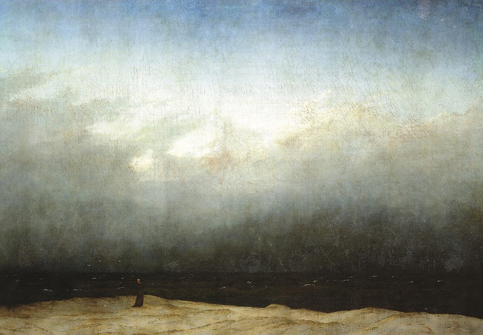‘숭고’를 미술작품으로 나타내면 어떻게 될까. 독일 낭만주의의 대표적 화가인 카스파 다비드 프리드리히 그림을 들 수 있다. 망망대해가 펼쳐지는 바닷가에 수도사가 홀로 외로이 서 있다. 그 앞에 검은 먹구름으로 가득한 하늘이 위협적으로 다가오고 있다. 이 위협적인 자연 앞에서 수도사는 인간이 그저 작고 나약한 존재일 뿐이라고 생각한다. 그리고 잠시 후, 거대하고 장엄한 자연 앞에서 외경심을 갖게 되고, 경이로움과 찬탄의 감정에도 휩싸인다. 위협적인 자연과 인간의 대비를 통해서 숭고미를 표현한 전형적인 작품이다.