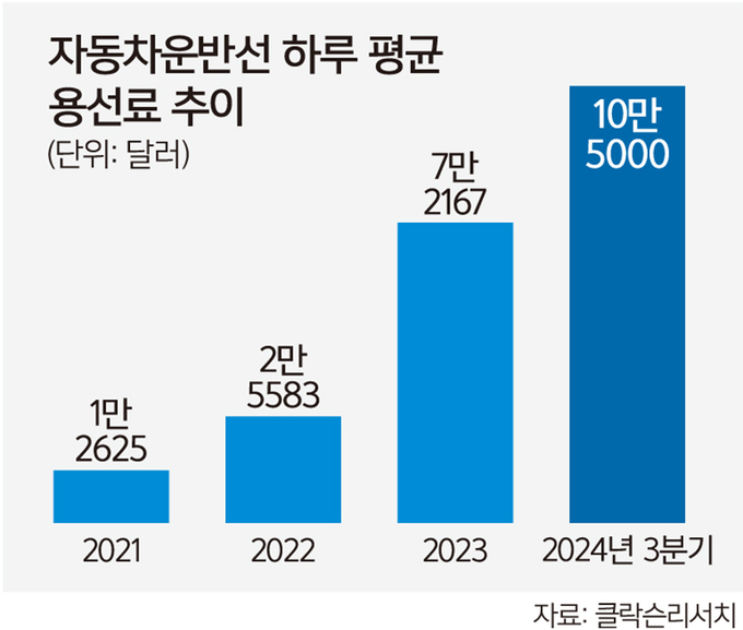 코로나19 대유행이 시작된 이후인 2021년 연평균 용선료가 1만2625달러(약 1700만원) 수준이었던 것과 비교하면 8배 이상 치솟은 것이다.