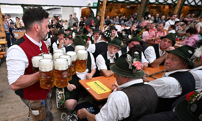 22일(현지시간) 독일 뮌헨에서 열린 옥토버페스트 맥주 축제에서 여러 맥주잔을 든 직원이 전통복장을 착용한 방문객들에게 잔을 건네고 있다. 매년 전 세계에서 600만명에 이르는 방문객이 축제를 찾는다. 옥토버페스트는 1810년 바이에른 왕국 왕세자 루트비히와 작센 테레제 공주의 결혼을 축하하는 행사에서 시작됐다. 올해 축제 기간은 지난 21일부터 다음달 6일까지다.