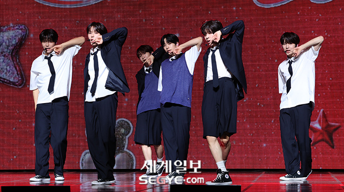 그룹 NCT WISH가 24일 오후 서울 용산구 블루스퀘어 마스터카드홀에서 열린 첫 미니앨범 ‘Steady’(스테디)의 쇼케이스에 참석해 열띤 공연을 펼치고 있다.